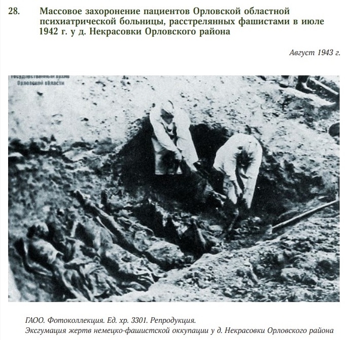 «Вступив в город 5 октября 1941 г., немецкие части начали массовые аресты жителей. Арестованные мирные жители – старики, женщины и дети. Советско-партийный актив и военнопленные загонялись в сараи, где содержались в голоде и холоде. Из сарая захваченные люди на улицах выводились со связанными руками сзади, группами по 30–50 человек, а иногда и до 100 человек, …, ставились лицом к яме и расстреливались из пулеметов или автоматов».