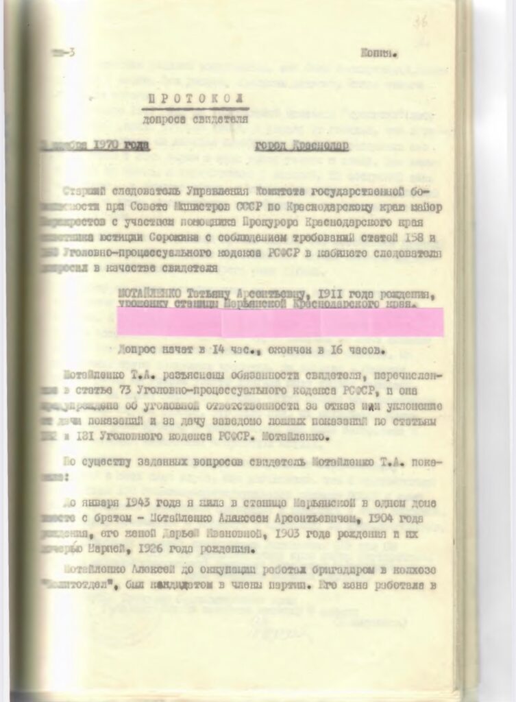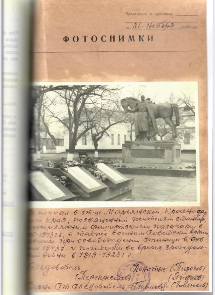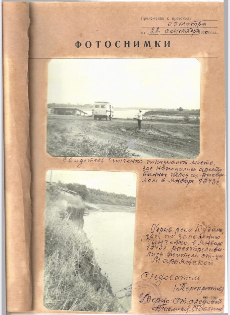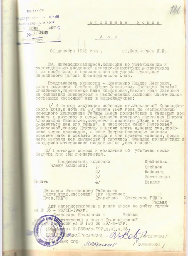 В ст. Новомышастовской Марьянского района Краснодарского края и после отступления немецкой армии из ст. Новомышастовской 20 февраля 1943 года в помещении церкви было обнаружено 18 человек военнопленных красноармейцев, зверски замученных и расстрелянных. Все тела их были зверски изуродованы с выколотыми глазами и по несколько штыковых ранений в каждом трупе. Издевательства и расстрелы, как установлено производились немецкими солдатами по распоряжению немецкого коменданта офицера Гейнце Юзенфа».В период оккупации немецкими войсками ст. Марьянской Краснодарского края, по распоряжению немецкого коменданта с.х. группы офицера Гейнца Юзефа в ночь на 20 января 1943 года была арестована группа мирных жителей в количестве 31 человека, которых расстреляли. В аресте принимали участие жандармы и полицейские. Ими были арестованы – Гладыш Степан Иванович 64 года, Гелеверова Анна Владимировна 50 лет, Мотайло Алексей 33 года с женой Дарьей Иванов ной 33 года и дочкой Марией Алексеевной 16 лет, Бабенко Иван Пантелеймонович с женой Марией Петровной 50 лет, с сыновьями Петром Ивановичем 16 лет, Иваном Ивановичем 14 лет, Панко Анастасия Павловна 40 лет с дочкой Лидией Трофимовной 9 лет, Олефиренко Мария Спиридоновна 65 лет, Толикин Лаврентий Леонтьевич с женой Ульяной Кузьминичной 45 лет, дочкой Марией Лаврентьевной 20 лет, Пустова Ирина Трофимовна с сыном Иваном Лукичем 14 лет и дочкой Аллой Лукиничной 4 года, Горицкая Ксения Иосифовна 23 года с дочкой Валентиной 2-х лет и др. Все вышеуказанные арестованные подверглись пыткам и избиению. После всего этого им было объявлено, что их будут эвакуировать в другой район. Всех выстроили и погнали к реке Кубань и у берега реки были зверски замучены и расстреляны, а после чего все расстрелянные были сброшены в реку Кубань. Принадлежащее имущество расстрелянных, жандармерия и полиция разграбила и присвоила себе».
